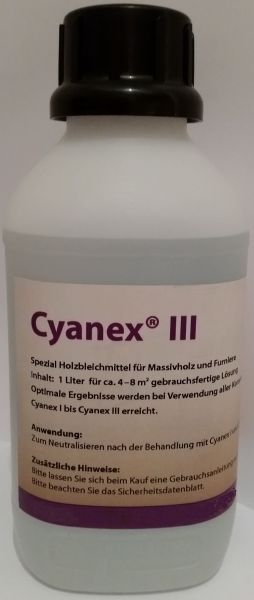 CYANEX III ist ein Neutralisationsmittel. Es dient zur Nachbehandlung der mit CYANEXI und II bearbeiteten Holzes oder Furniers und neutralisiert den Untergrund. Es eignet sich zur Entfernung von frischen Kalk- und Zementflecken.